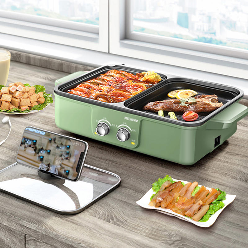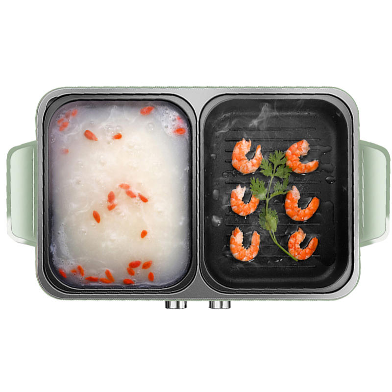 "颜色 - 绿色电压 - 220V~频率 - 50Hz功率 - 1200W容量 - 4L烤箱/1.5L煮锅核心卖点1.边吃边追剧,手机支架锅盖提手;2.分区加热涮烤独立温控双开关独立控制温度;3.不焦不粘少油烟健康环保涂层,荷叶物理不粘原理,均衡受热不粘锅;4.两档火力,双锅自由操空;5.环形发热管分体加热,嵌入式设计,减少热能损耗,升温导热均匀。"